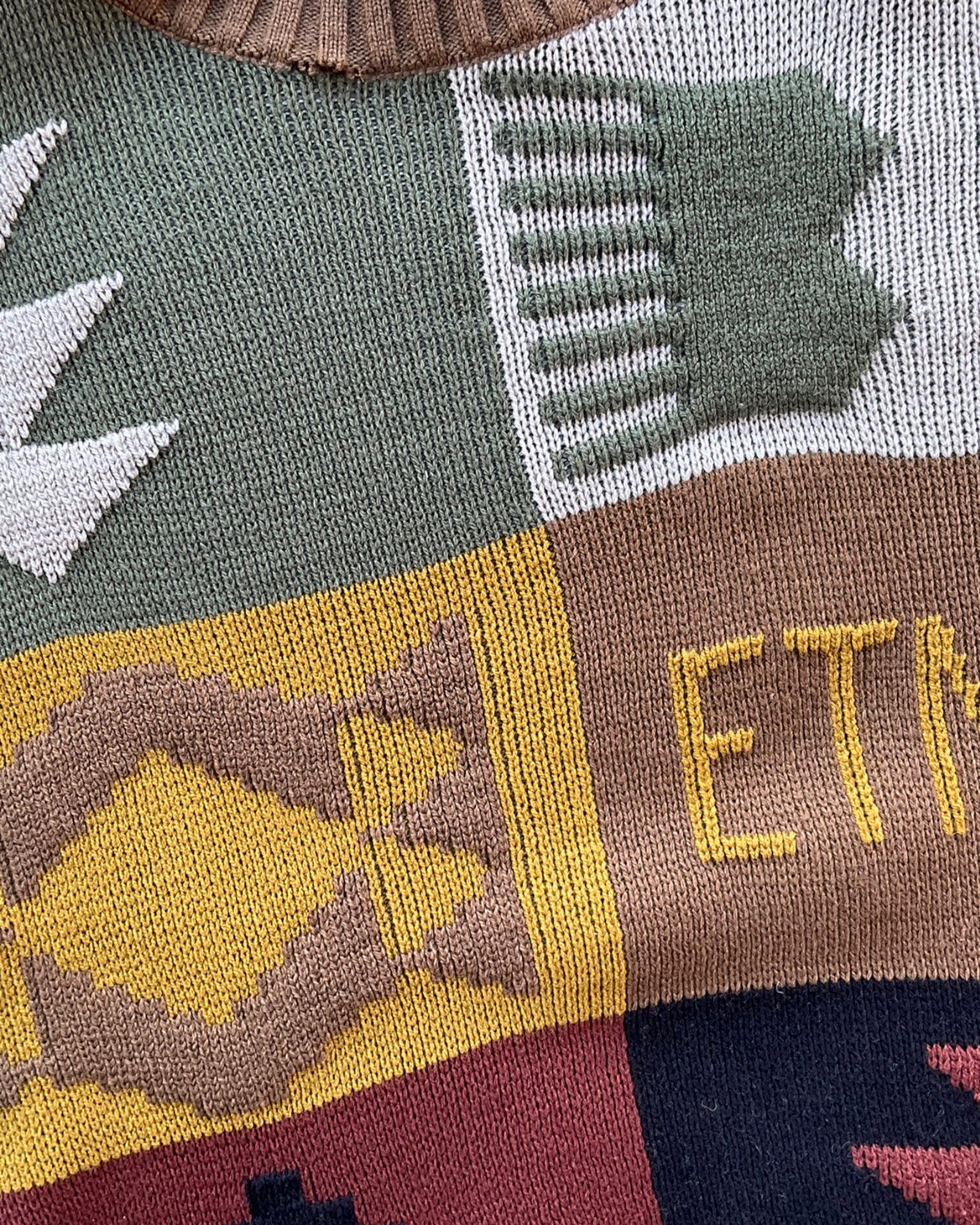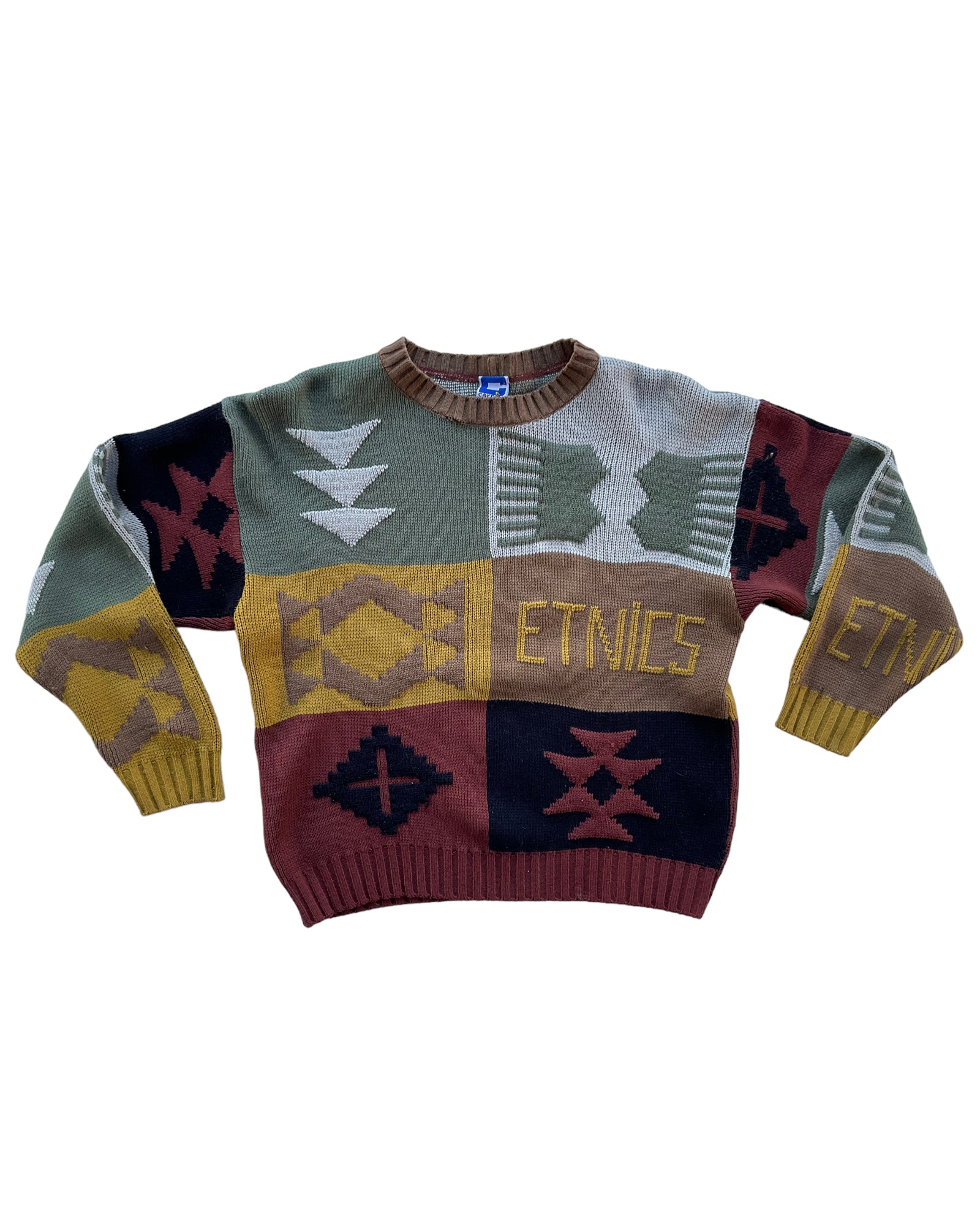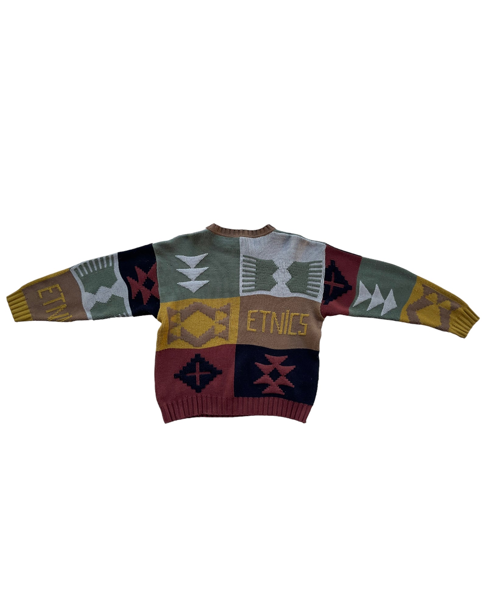 SUÉTER DE COLORES CON DISEÑO Y ESTAMPADO POR AMBOS LADOS, TEJIDO, CON LIGERO DESGASTE POR ANTIGÜEDAD