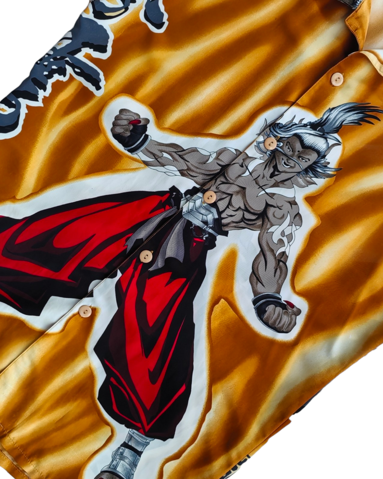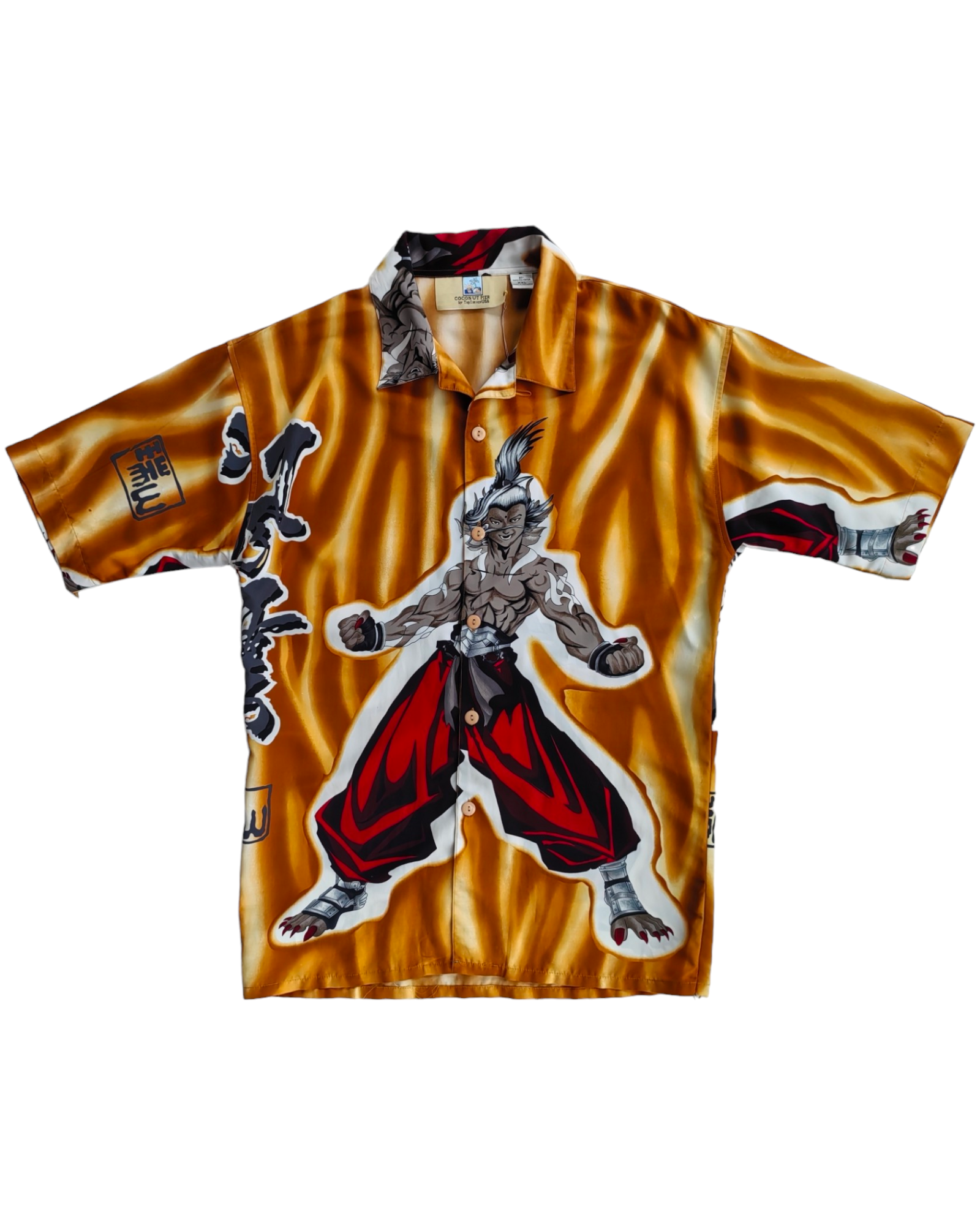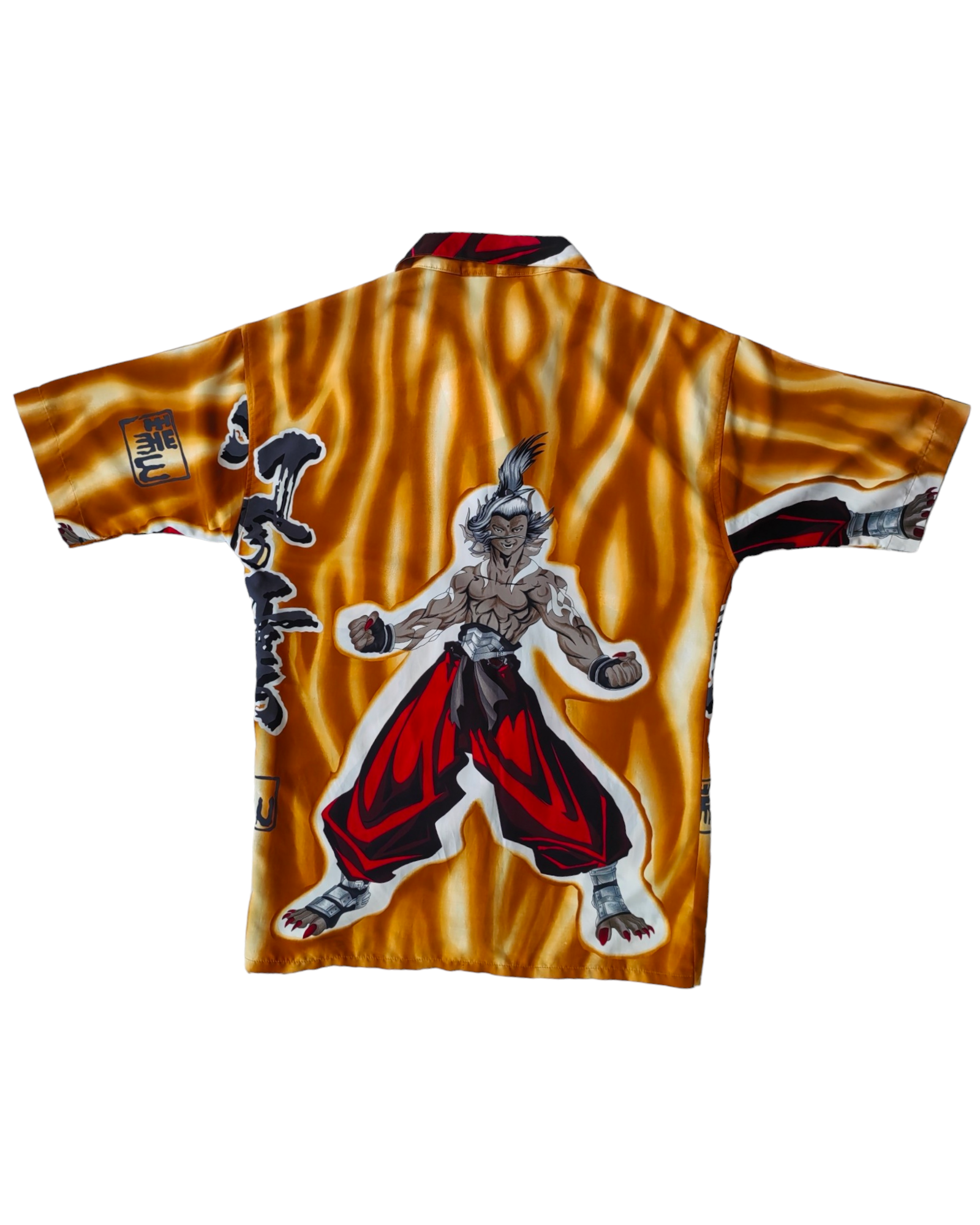 CAMISA LARGA, COLOR AMARILLO, CON ESTAMPADO DE PERSONAJE Y LETRAS ASIÁTICAS, 100% POLIESTER. PEQUEÑO AGUJEROS EN LA. MANGA DERECHA