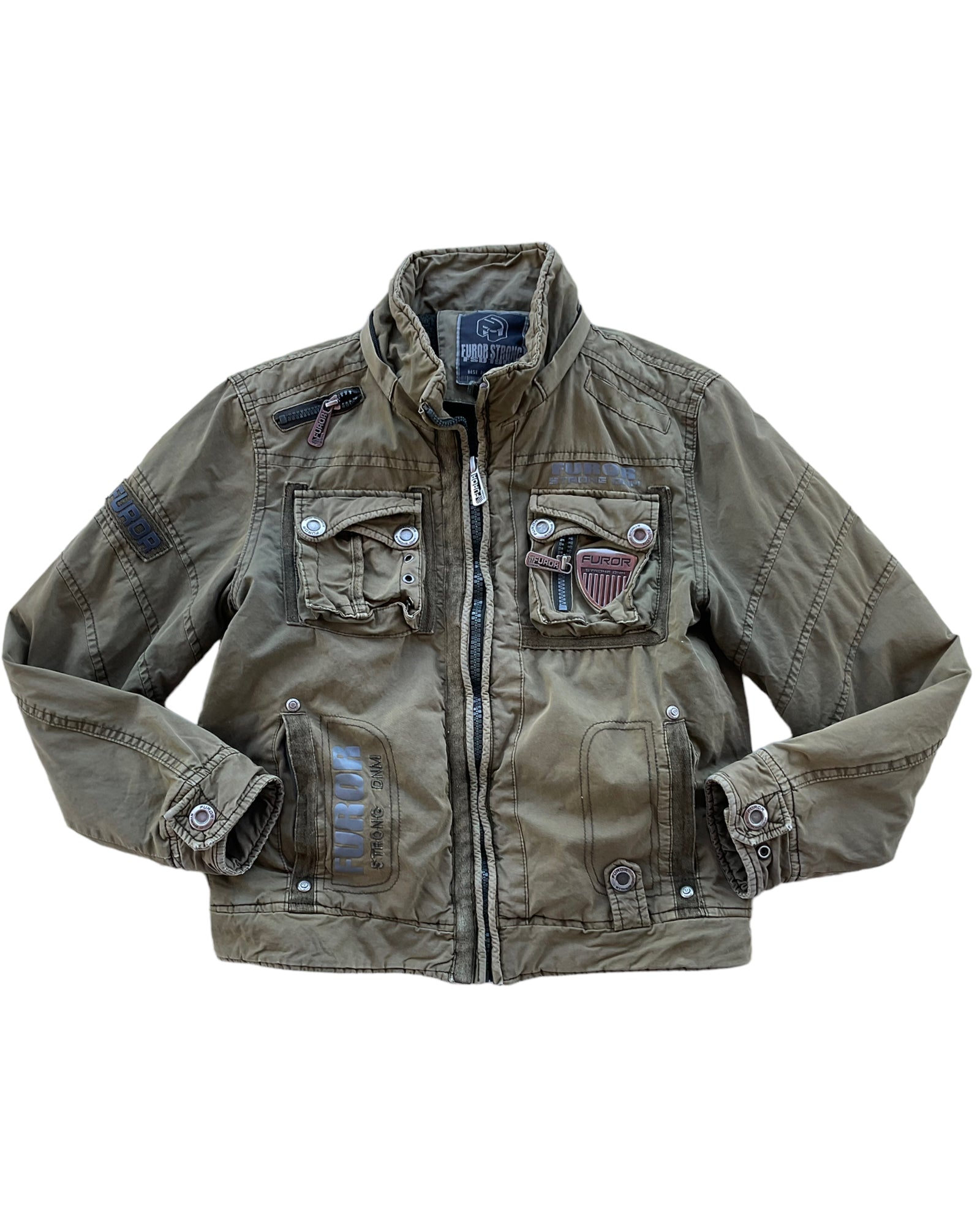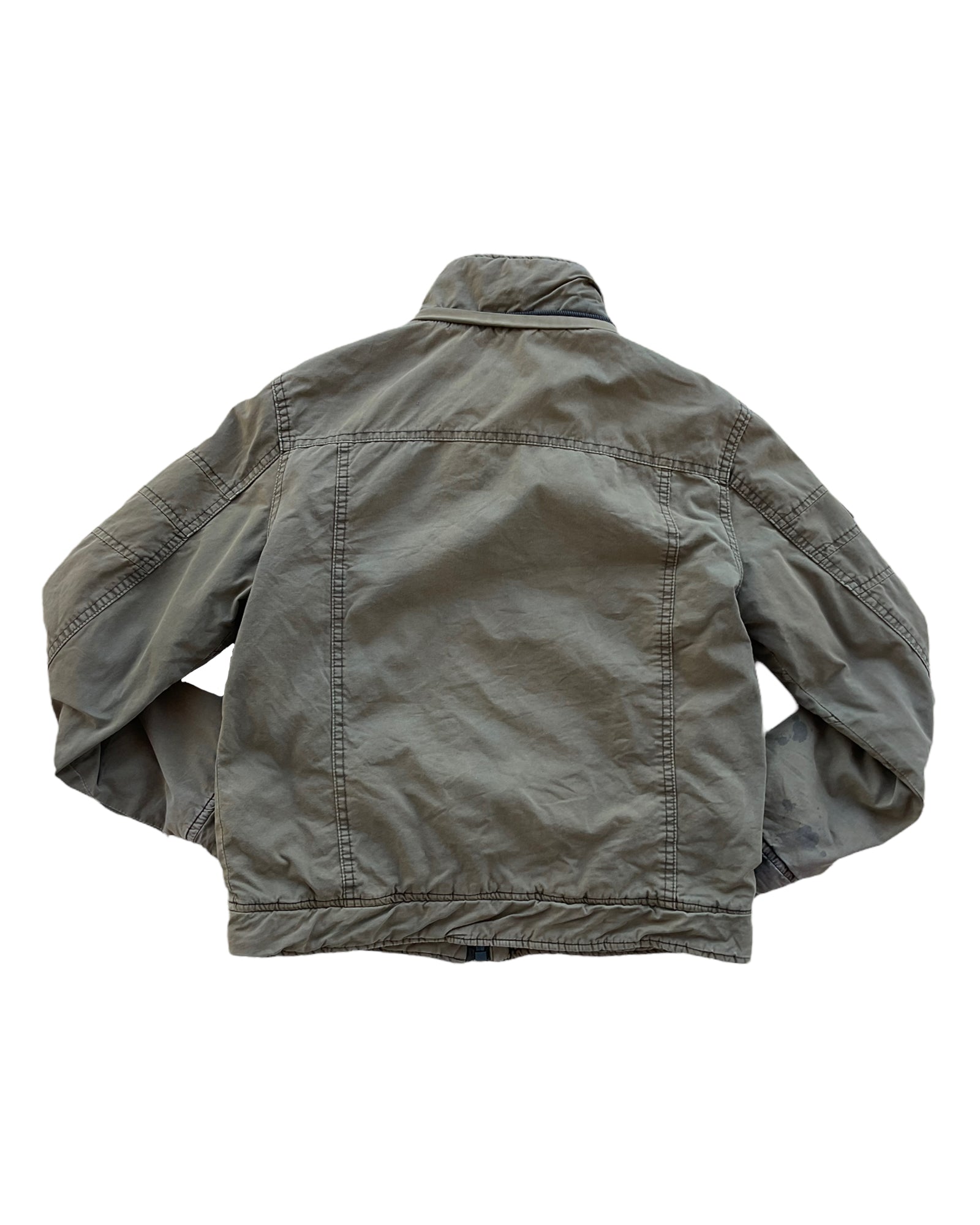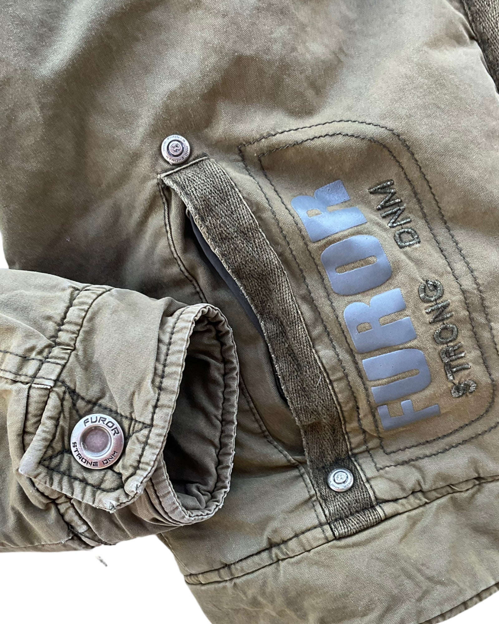 CHAMARRA VERDE OLIVO, CORTA, CON 4 BOLSILLOS AL FRENTE, CIERRE POR EN MEDIO Y EN UN HOMBRO, ESTAMPADO DEL NOMBRE DE LA MARCA AL FRENTE Y EN EN UNA MANGA, LISA Y SIN ESTAMPADOS POR DETRÁS, CON MANCHAS POR ANTIGÜEDAD EN MANGA DERECHA, FORRO Y RELLENO 100% POLIESTER, EXTERIOR 100% ALGODÓN