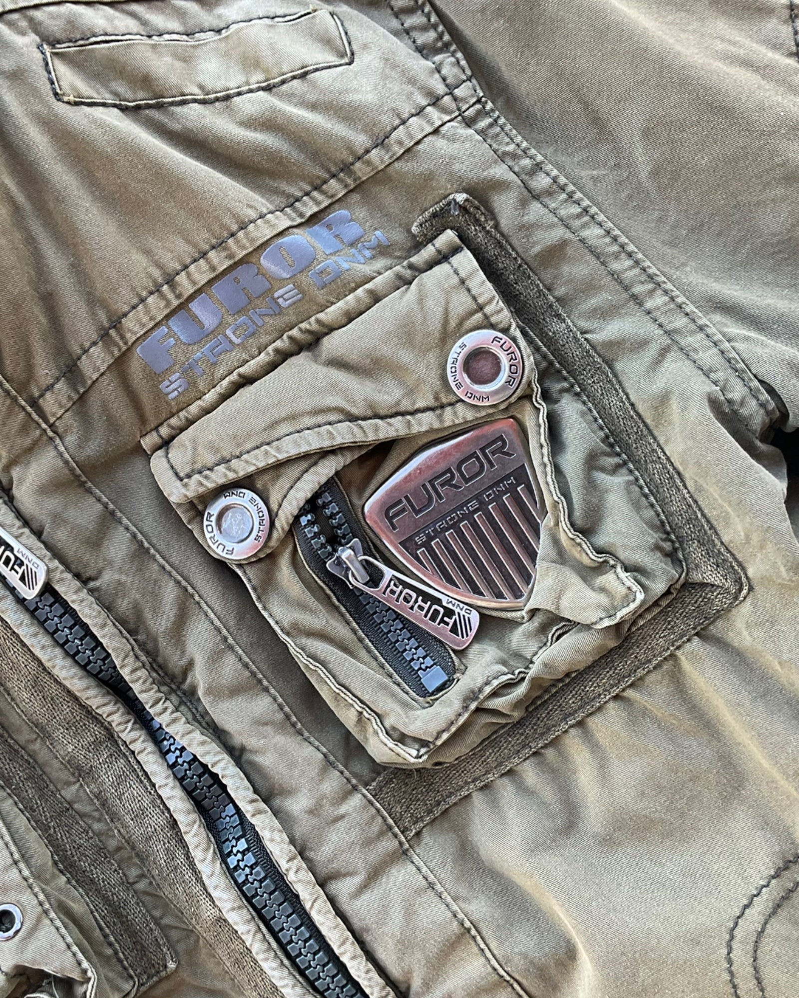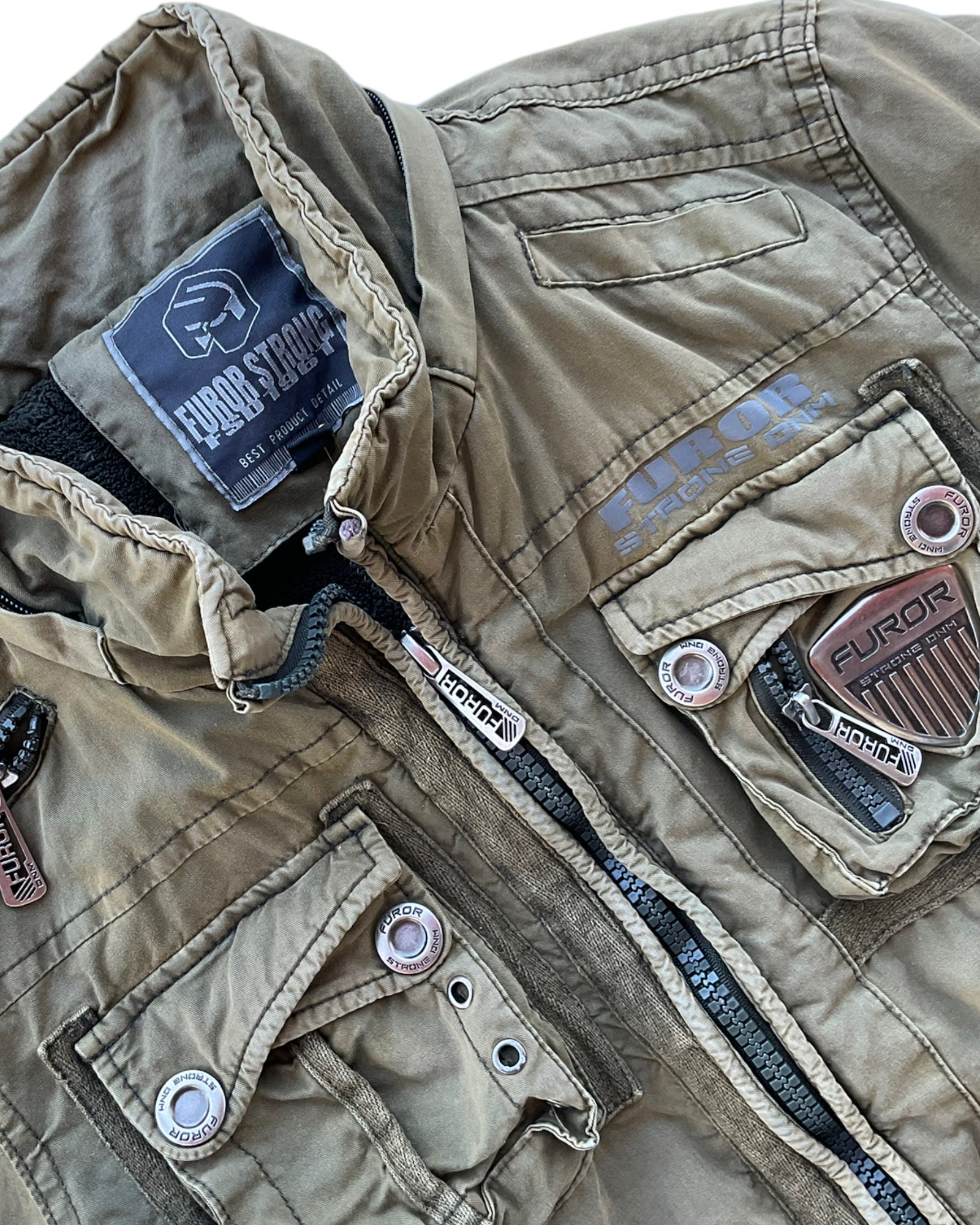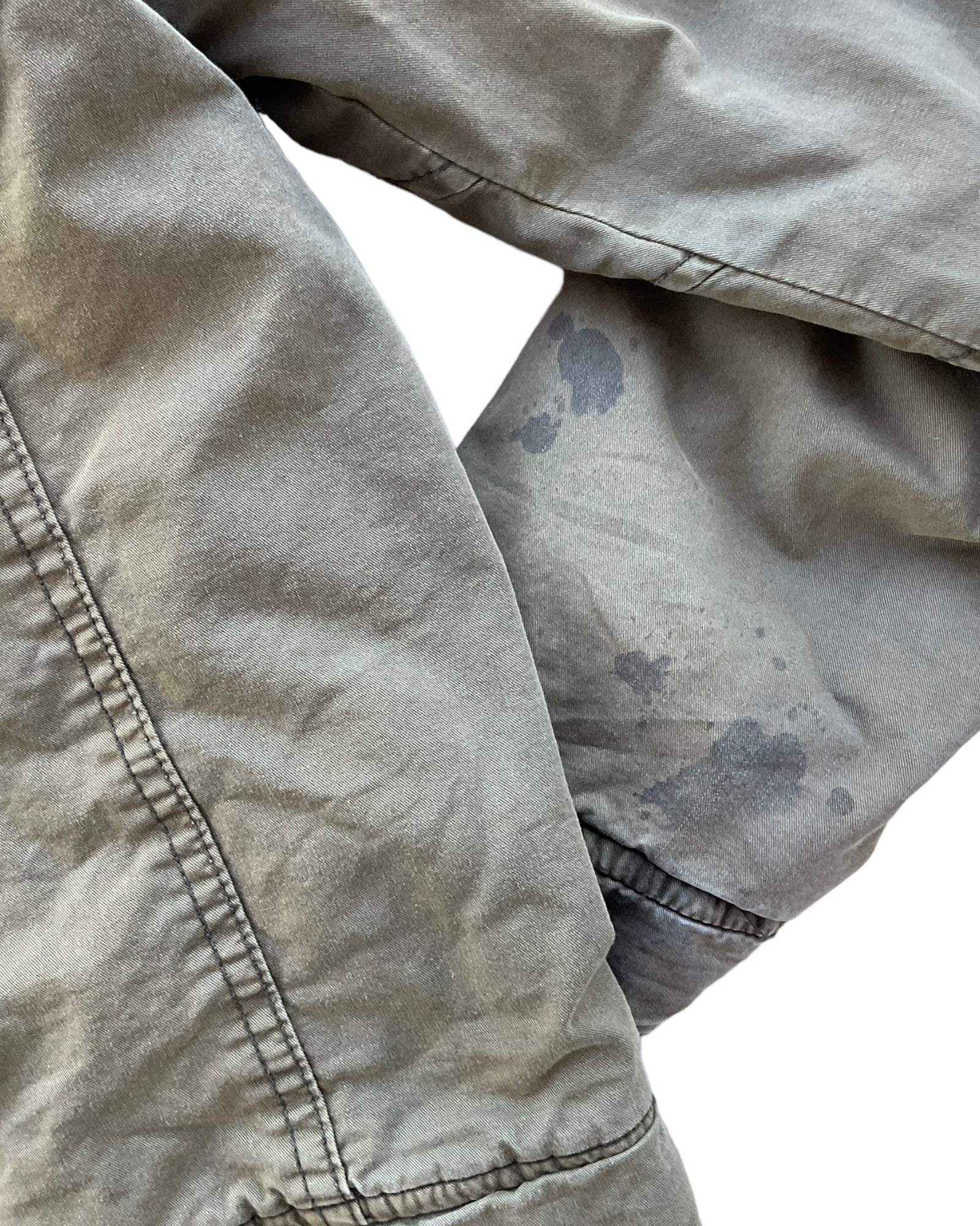 CHAMARRA VERDE OLIVO, CORTA, CON 4 BOLSILLOS AL FRENTE, CIERRE POR EN MEDIO Y EN UN HOMBRO, ESTAMPADO DEL NOMBRE DE LA MARCA AL FRENTE Y EN EN UNA MANGA, LISA Y SIN ESTAMPADOS POR DETRÁS, CON MANCHAS POR ANTIGÜEDAD EN MANGA DERECHA, FORRO Y RELLENO 100% POLIESTER, EXTERIOR 100% ALGODÓN