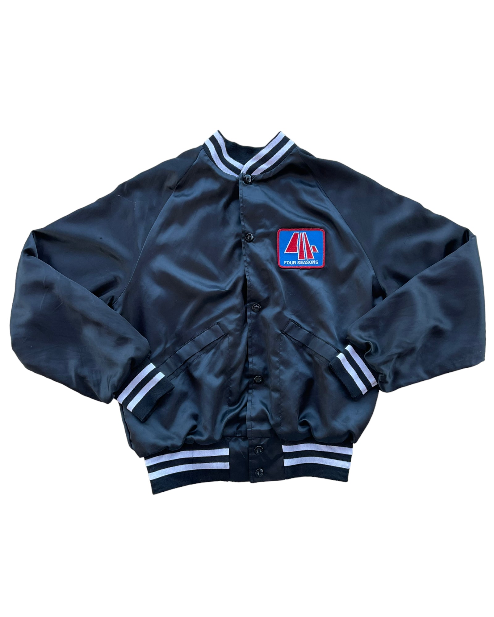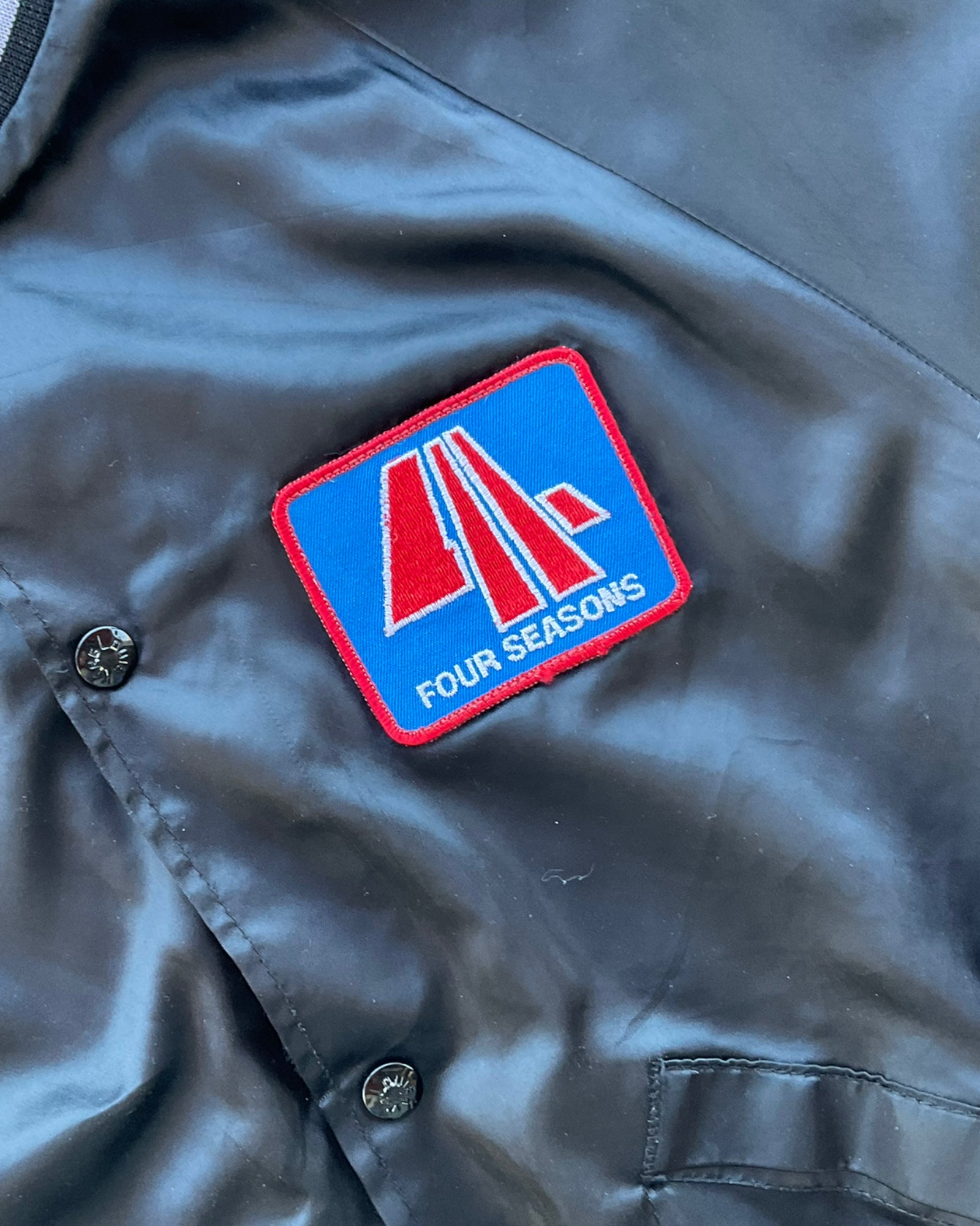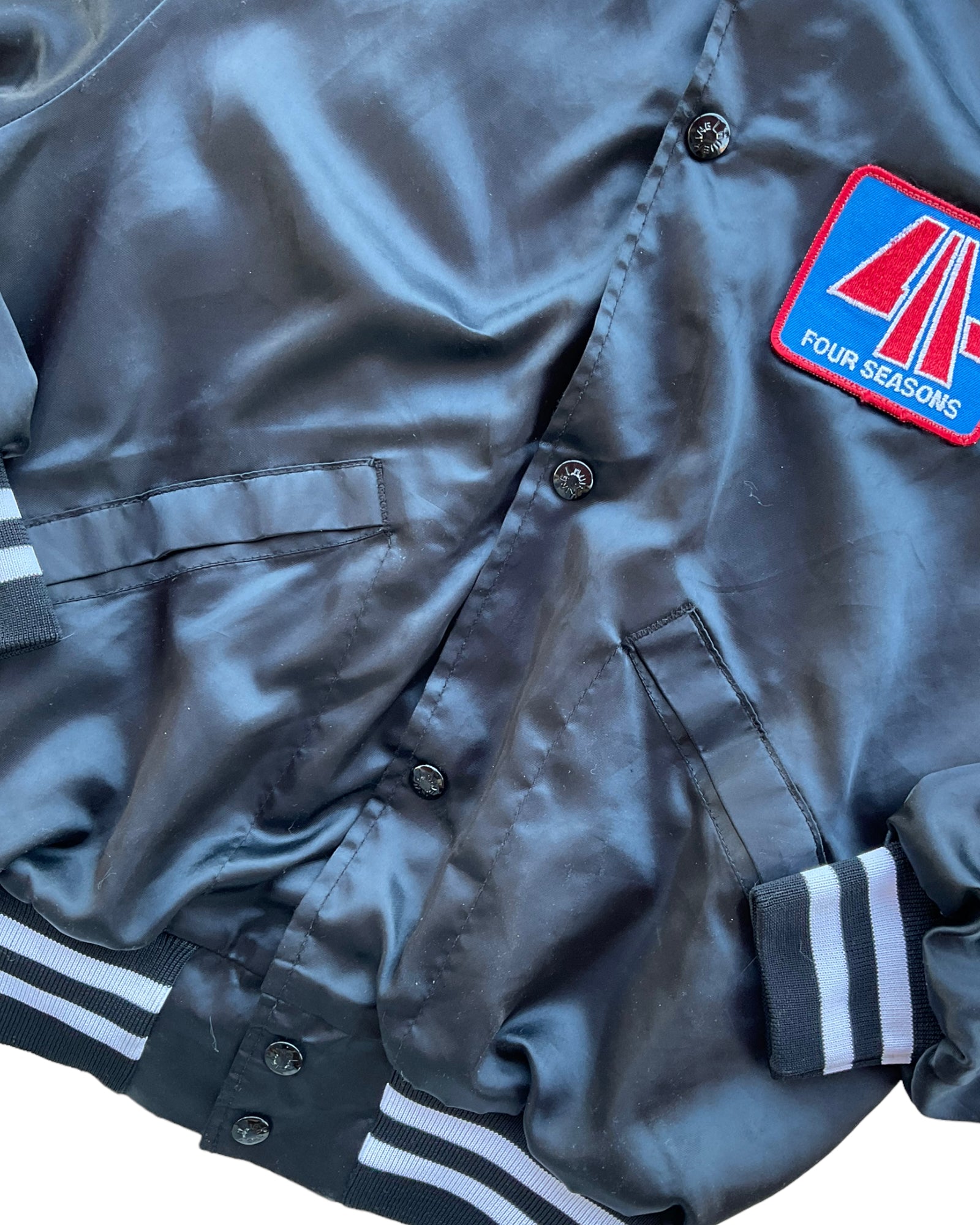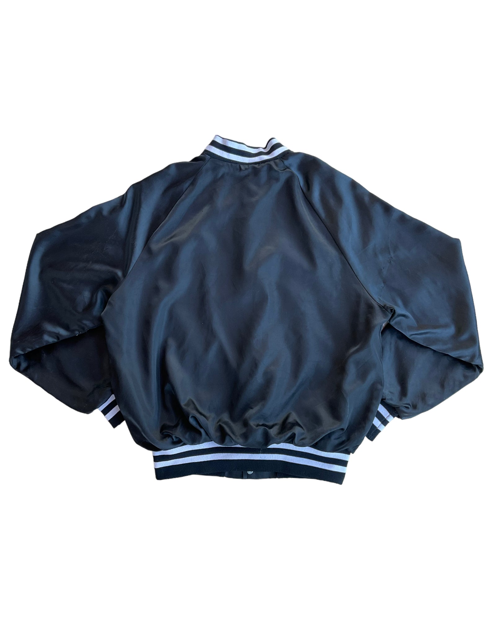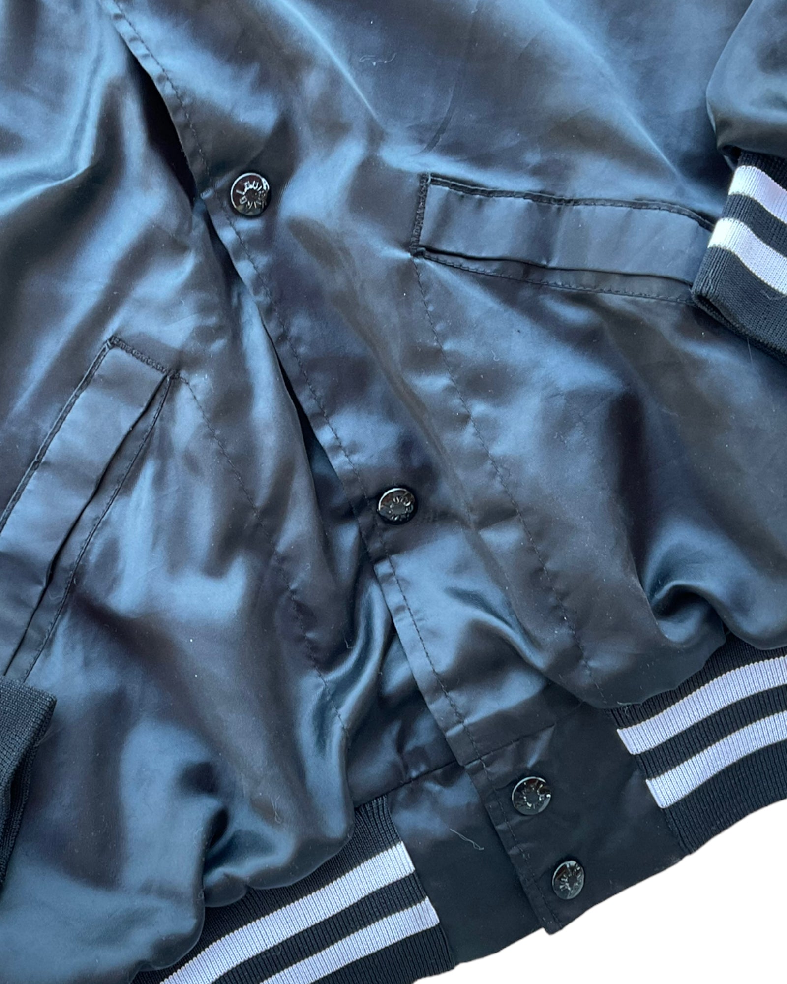 CHAMARRA NEGRA SATINADA, CON BORDES RAYADOS EN BLANCO Y NEGRO, DOS BOLSAS DELANTERAS, BOTONES POR EN MEDIO, UN PARCHE EN EL PECHO, LISA Y SIN ESTAMPADOS POR EL REVERSO, 100% POLIESTER