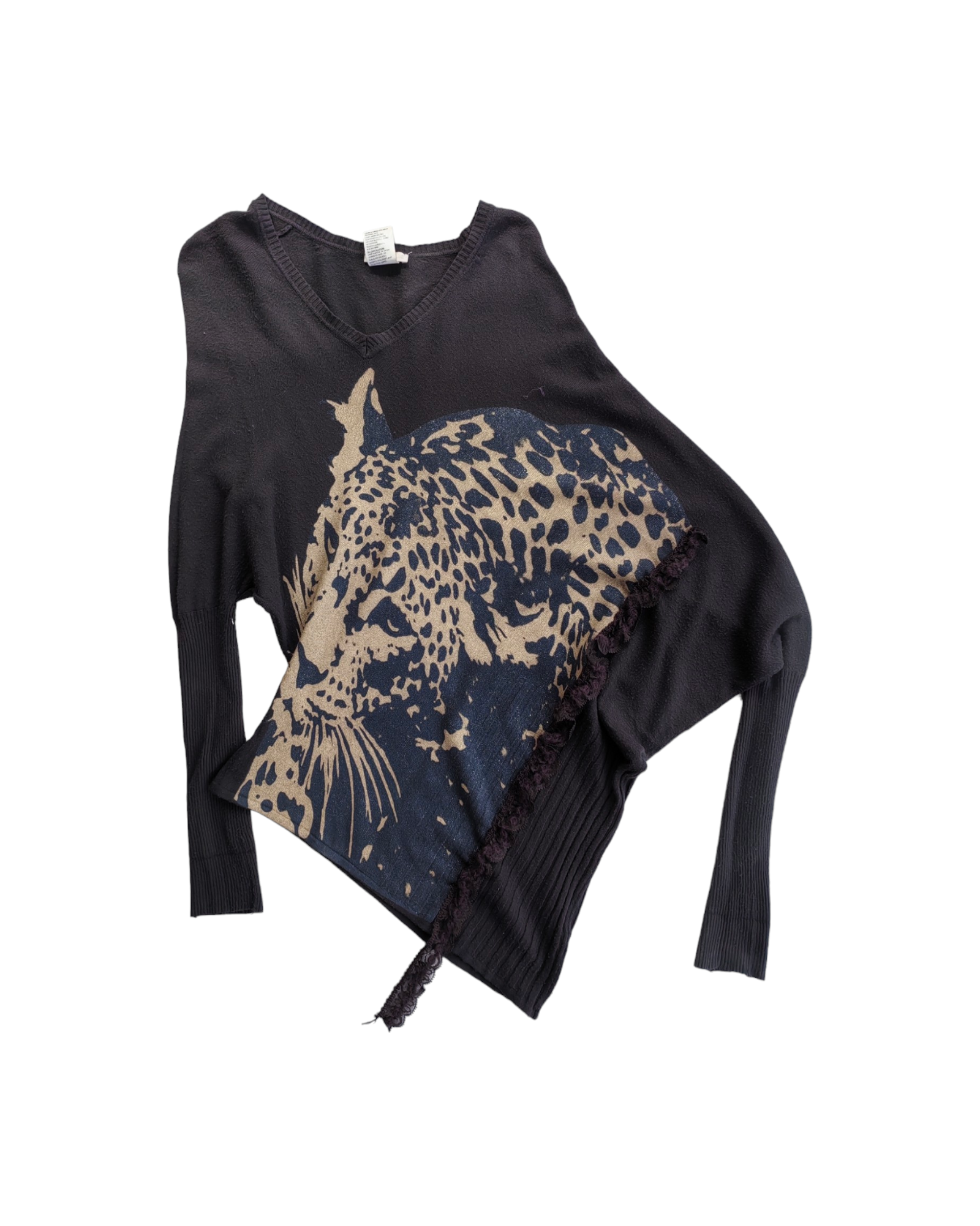 SUÉTER GRIS CON CORTE ASIMÉTRICO, CON ESTAMPADO DE LEOPARDO, ENCAJE AL FRENTE, MANGAS CON TEXTURA DE RAYAS, ESCOTE EN "V", LISO Y SIN ESTAMPADO AL REVERSO, CON DESGASTE EN TELA POR ANTIGÜEDAD 50% ACRILICO, 30% VISCOSA, 20% LANA