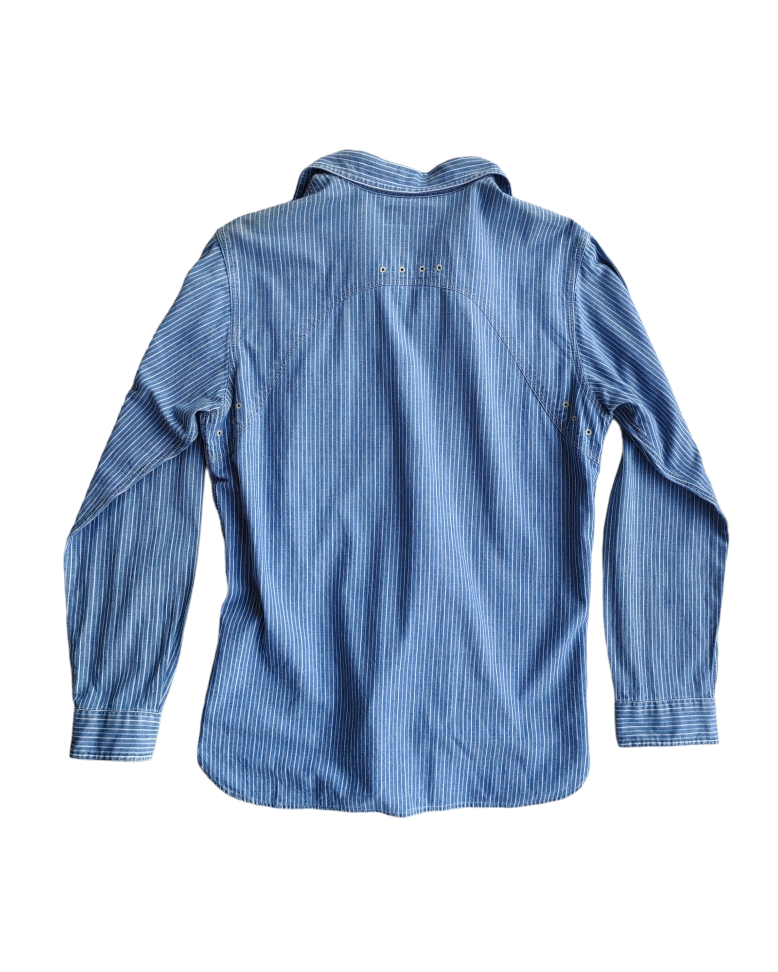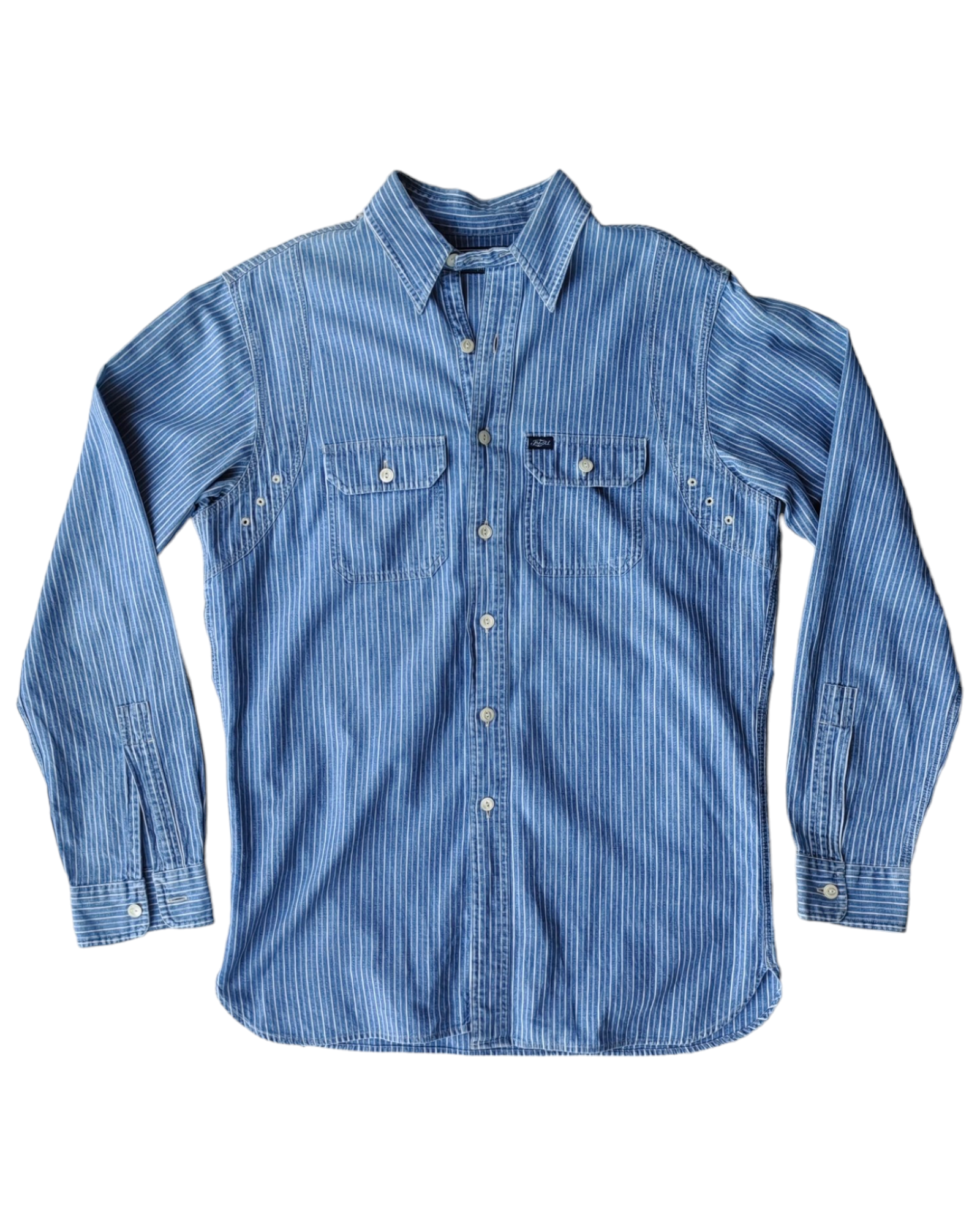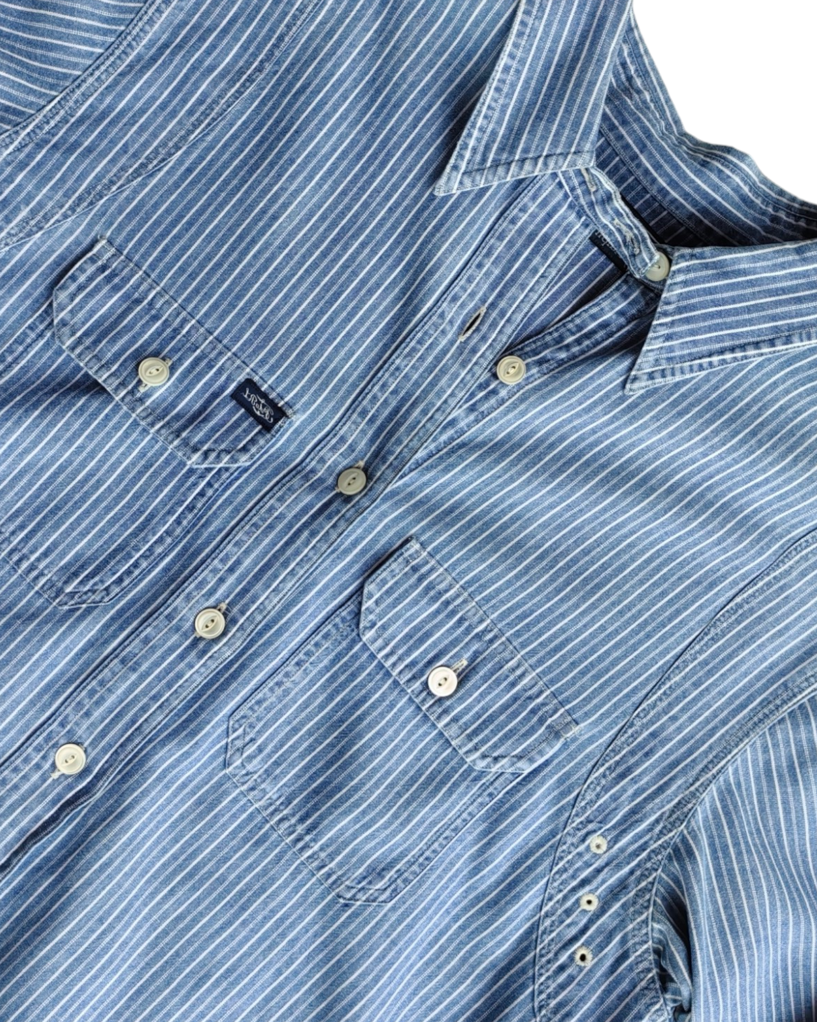 MiCAMISA AZUL, CON RAYAS BLANCAS, BOTONES AL FRENTE, DOS BOLSAS AL FRENTE, 100% ALGODÓN