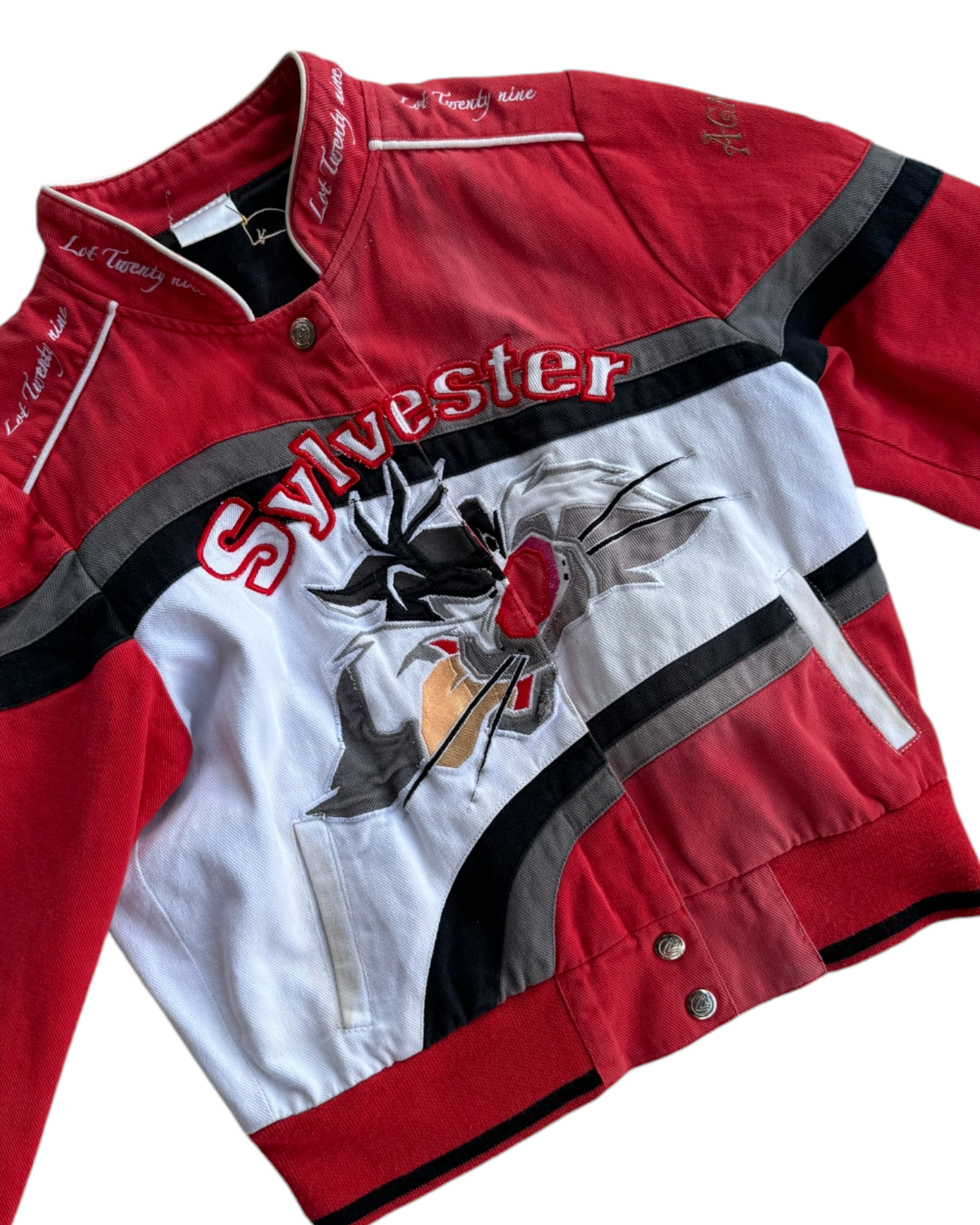 CHAMARRA CORTA DE MEZCLILLA EN COLOR ROJO CON DETALLES NEGROS, BLANCOS Y GRISES, BORDADO DEL GATO SILVESTRE Y SU NOMBRE AL FRENTE, BORDADO DE PIOLIN Y SILVESTRE AL REVERSO, BORDADO EN MANGAS Y BORDADO EN HOMBROS Y CUELLO CON LA FRASE "LOT TWENTY NINE" , 100% ALGODÓN, LIGERO DESLAVADO POR ANTIGÜEDAD