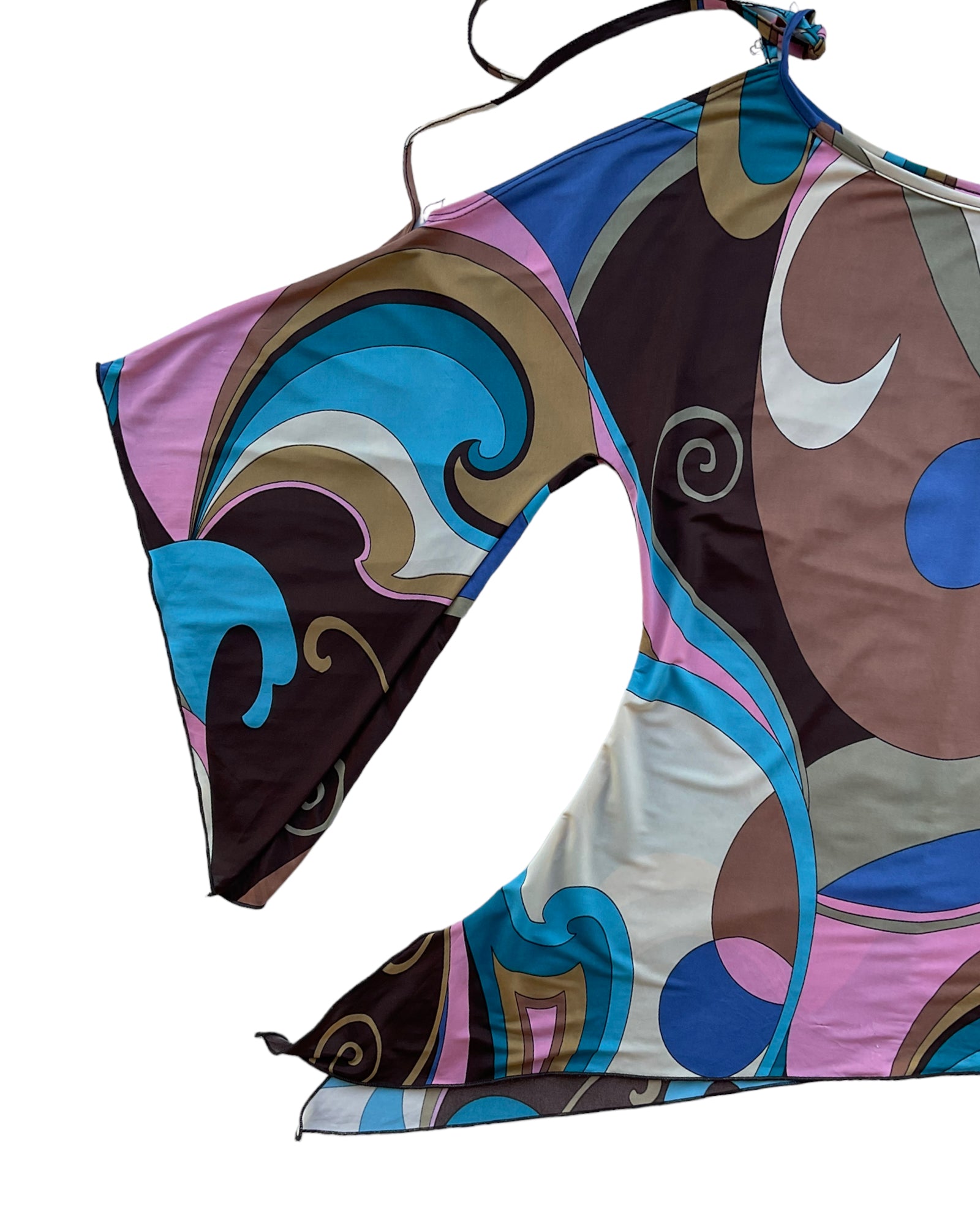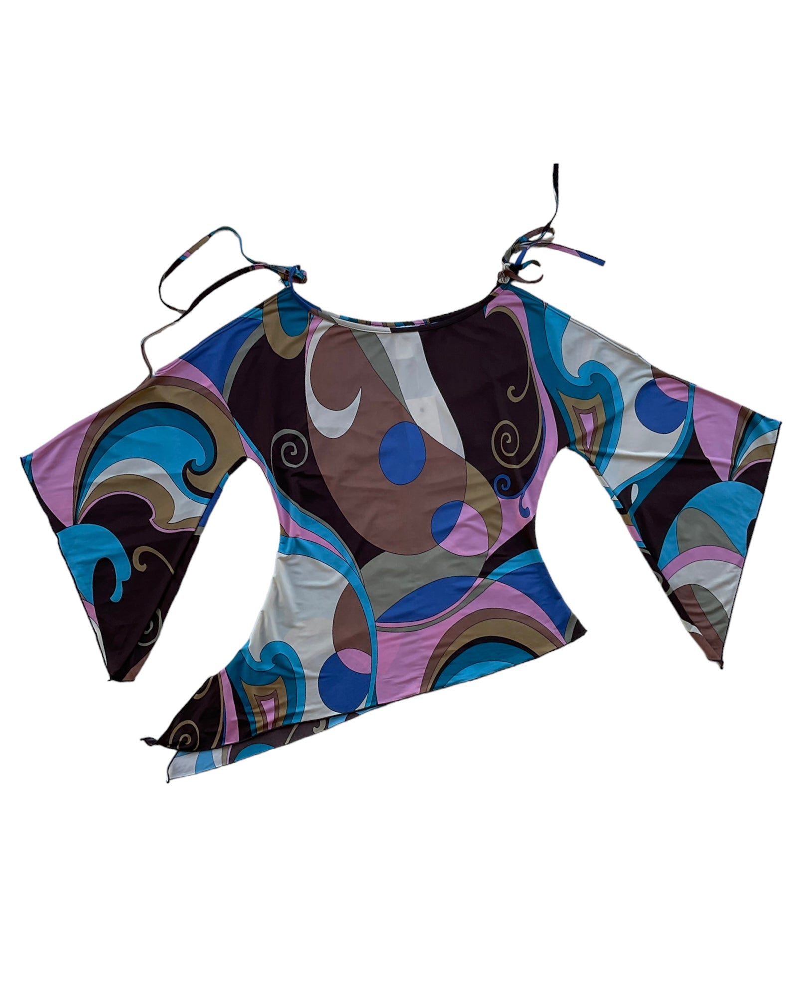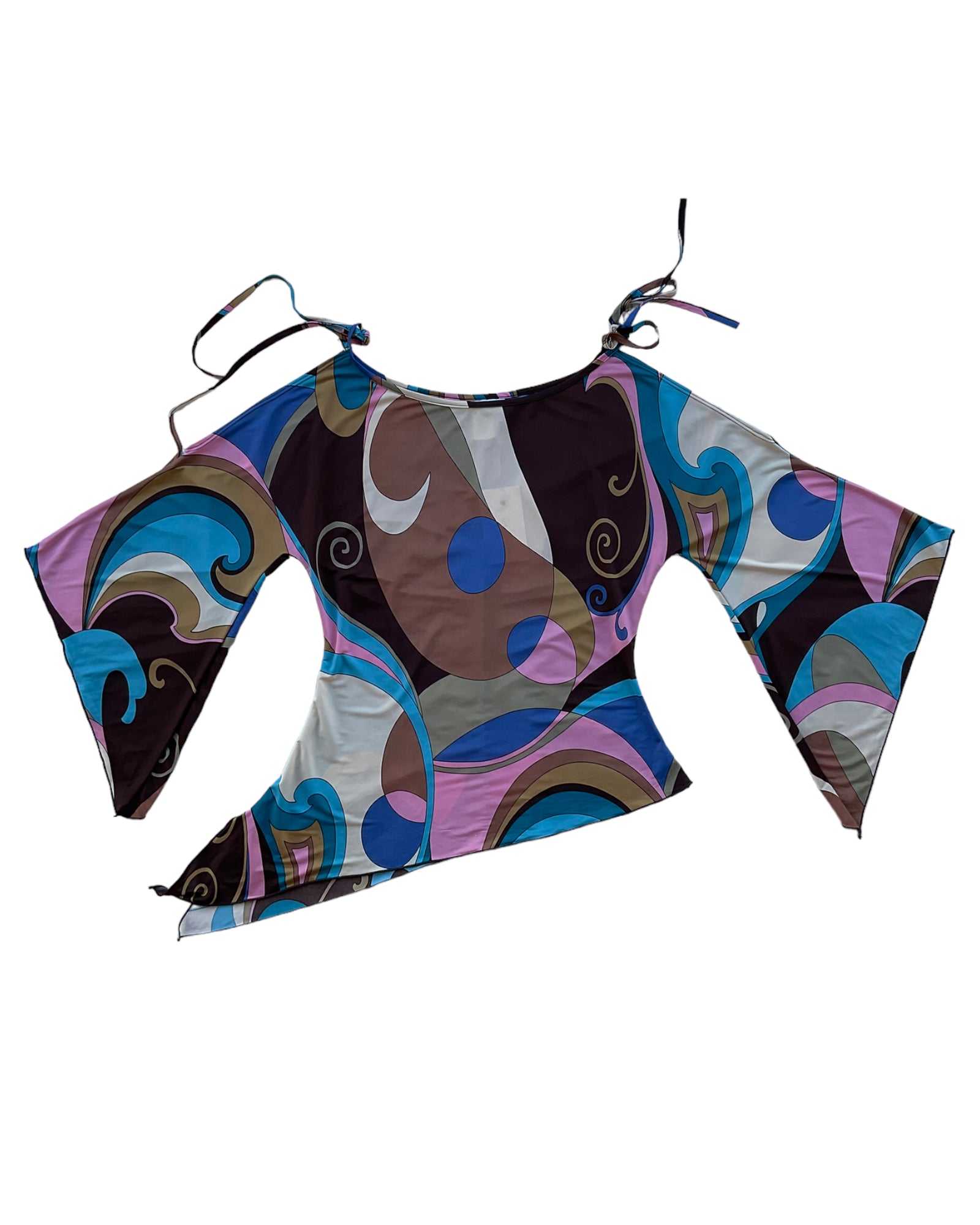 BLUSA DE TIRANTES Y MANGAS ACAMPANADAS, CON ESTAMPADO ESTILO MARMOLEADO DE COLORES, 92% POLIESTER, 8% SPANDEX
